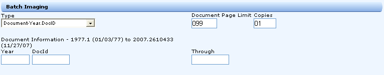 Document Information-the number of text boxes and their labels change depending on the Type selected. Enter the applicable Type information into the text boxes. In this example, these are the Year and DocID fields.